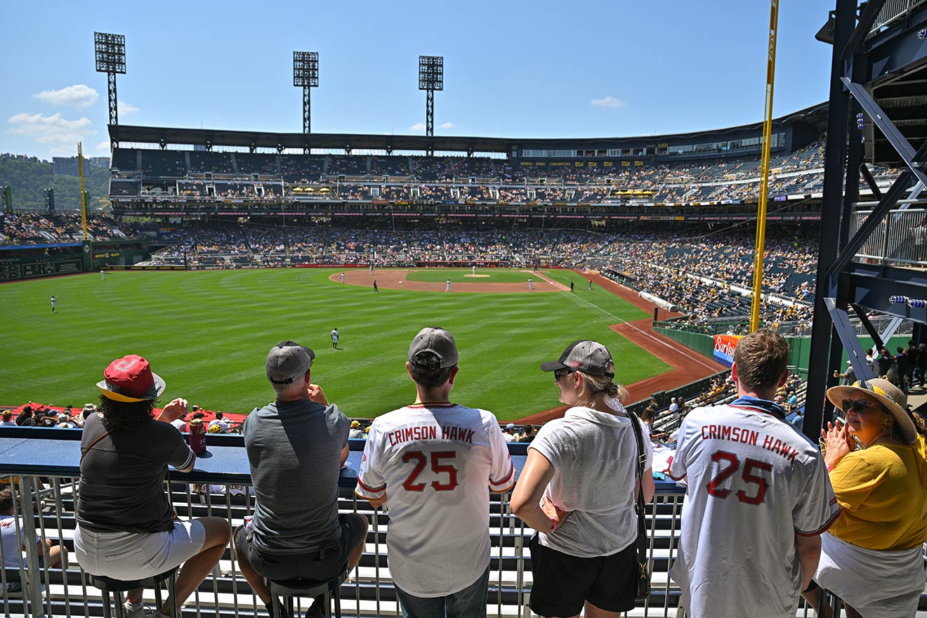 The 2025 edition of IUP Day at PNC Park, held on a steamy August afternoon, followed a familiar pattern. University alumni, students, employees, and their families enjoyed food and drink together in the Left Field Lounge; they received small gifts from the alumni office and a co-branded IUP-Pirates item—a button-down, white Pirates jersey with crimson and gray trim; and they beamed with pride when IUP was acknowledged on the Jumbotron. In addition, the ceremonial first pitch was again delivered by someone with IUP ties.